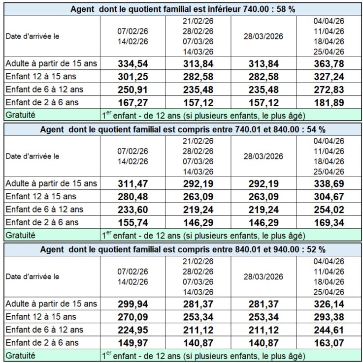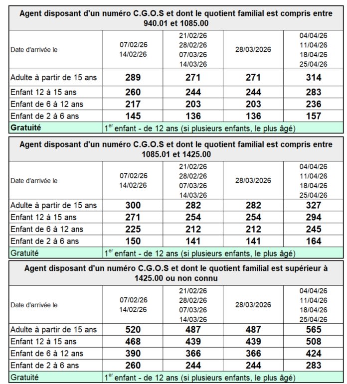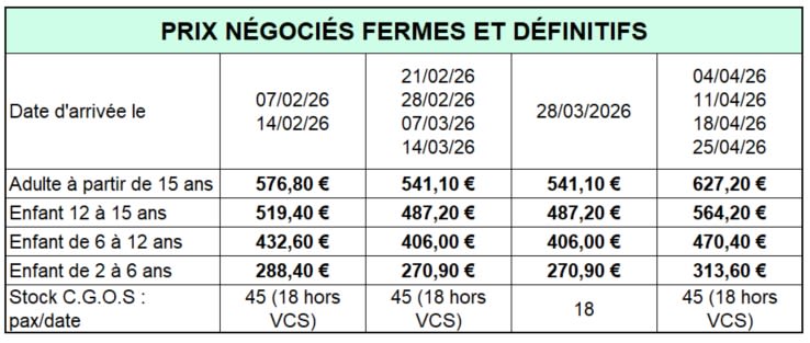 Le prix comprend : Cette formule comprend l'hébergement, l'accès aux installations du club, le linge de lit, le linge de toilette, la télévision, le wifi, la participation du C.G.O.S