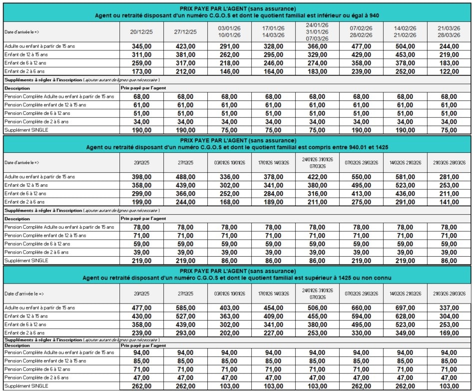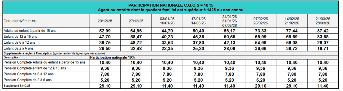 Le prix comprend : Cette formule comprend l'hébergement, l'accès aux installations du club, le linge de lit, le linge de toilette, la télévision, le wifi, la participation du C.G.O.S
