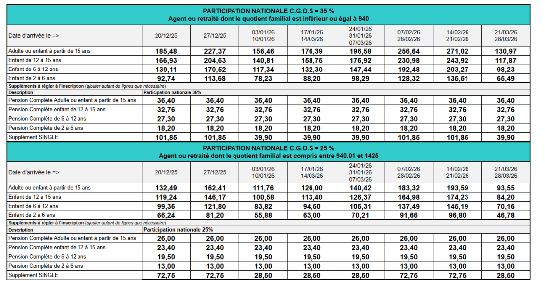 Cette formule comprend l'hébergement en chambre, les animations, l'accès aux installations du club, le linge de lit, le linge de toilette, la télévision, le wifi, la demi-pension, la participation du C.G.O.S.